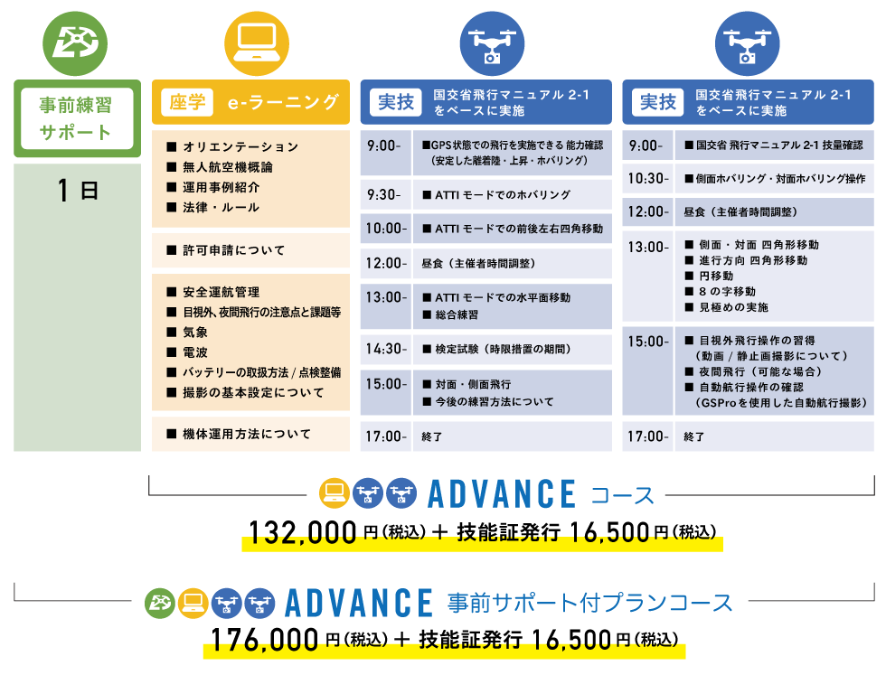 技能証の発行には10時間の飛行経験が必要です。本コースは7時間の飛行とみなされます。不足部分は練習用のトイドローンで補っていただくか、事前練習のプランをご活用ください。
